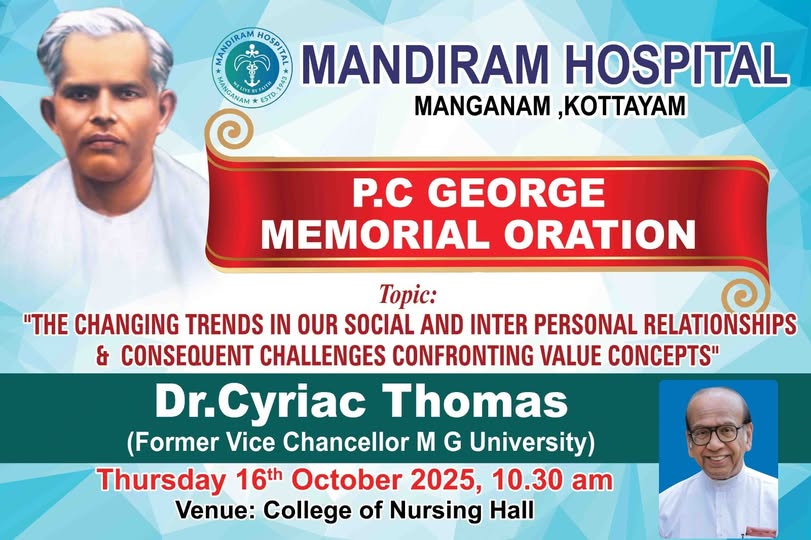 In memory of our founder, Sri P.C. George, a Memorial Lecture will be held at Mandiram Hospital, Manganam, Thursday, 16 October, 2025, at 10:30 a.m. in the Nursing College Hall. Dr. Syriac Thomas (Former Vice Chancellor, M. G. University) will deliver the keynote address. All are cordially invited to attend the program.