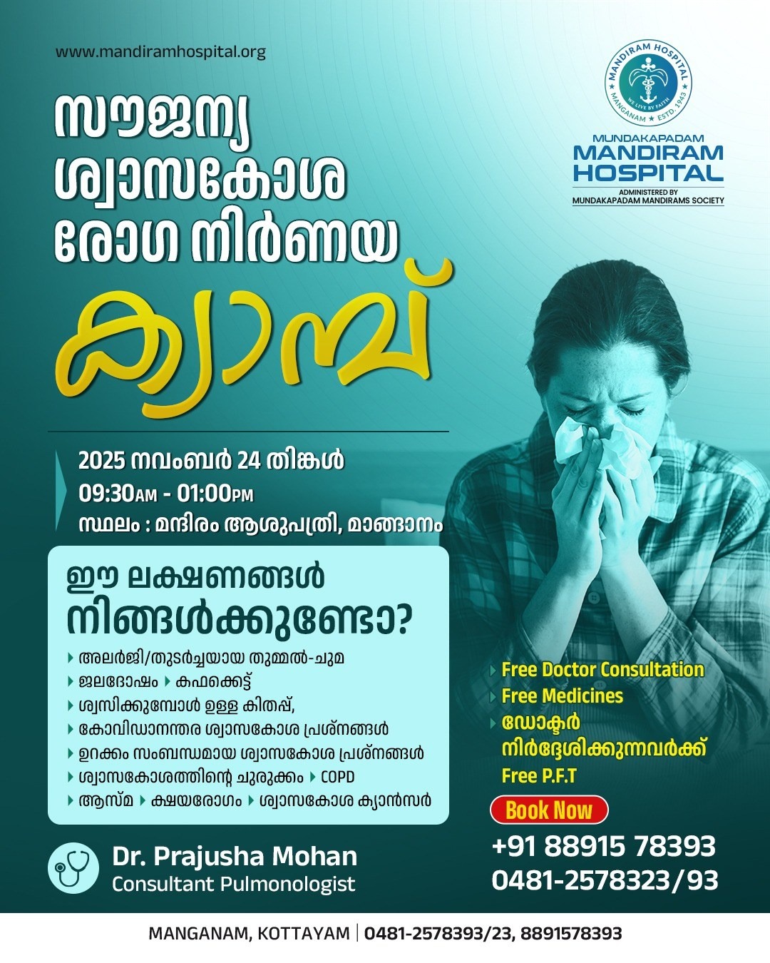 In memory of our founder, Sri P.C. George, a Memorial Lecture will be held at Mandiram Hospital, Manganam, Thursday, 16 October, 2025, at 10:30 a.m. in the Nursing College Hall. Dr. Syriac Thomas (Former Vice Chancellor, M. G. University) will deliver the keynote address. All are cordially invited to attend the program.